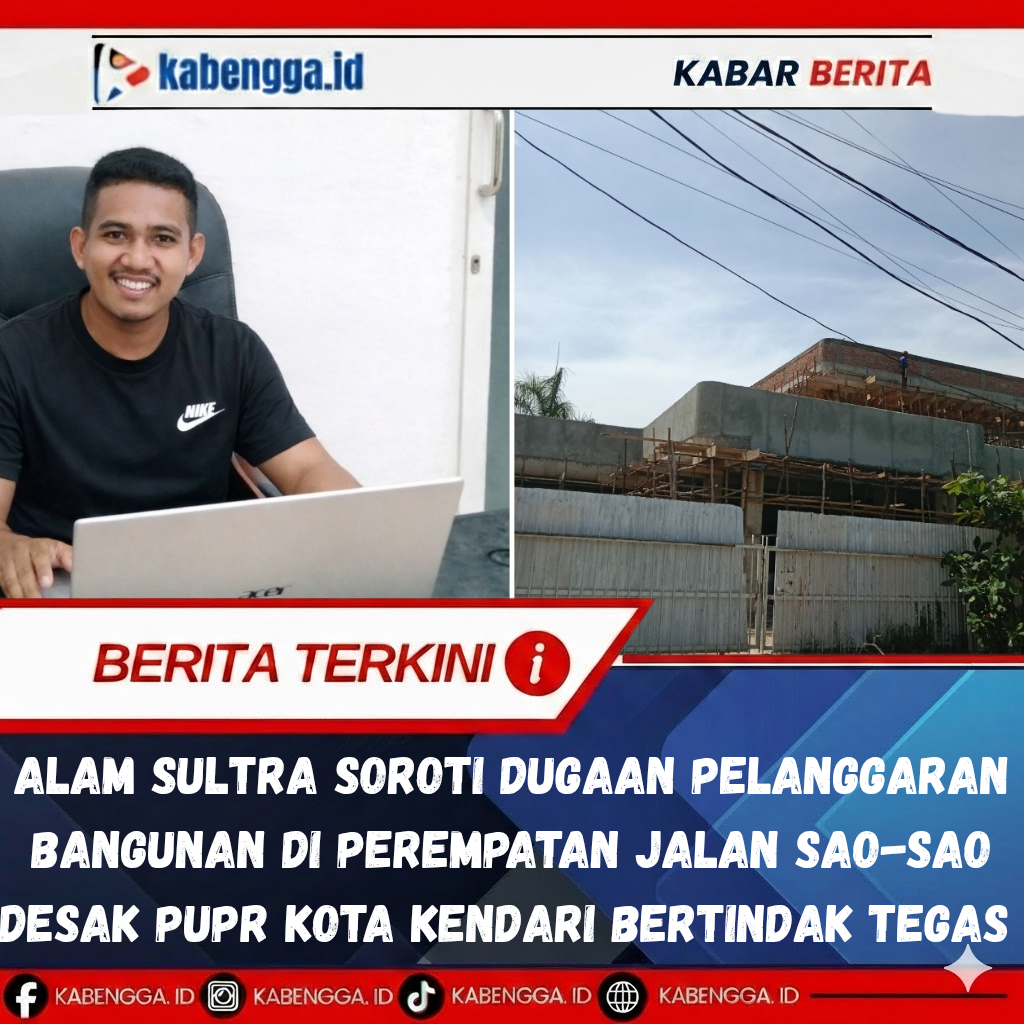 (ALAM Sultra) menyoroti keberadaan salah satu bangunan yang tengah berdiri di kawasan perempatan Jalan Sao-Sao, Kota Kendari, yang diduga melanggar ketentuan sempadan jalan serta belum mengantongi Persetujuan Bangunan Gedung (PBG)