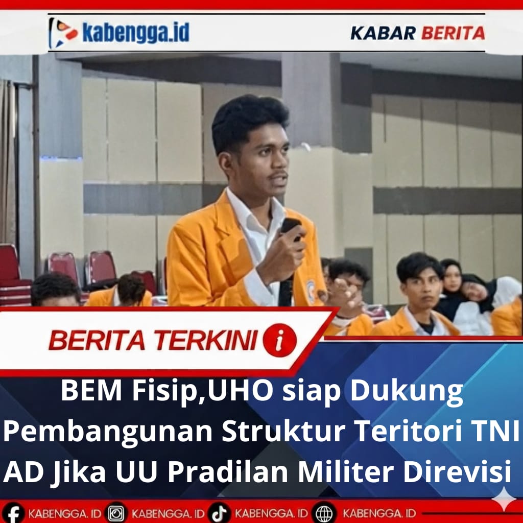 Kendari – Ketua BEM FISIP UHO Ahmad Zaky Multazam Fahmi siap mendukung rencana pembangunan struktur teritori TNI AD apabila reformasi sektor pertahanan dengan merevisi UU Nomor 31 tentang Peradilan Militer dilakukan. Hal ini bertujuan agar prajurit militer tunduk dan patuh pada peradilan umum.