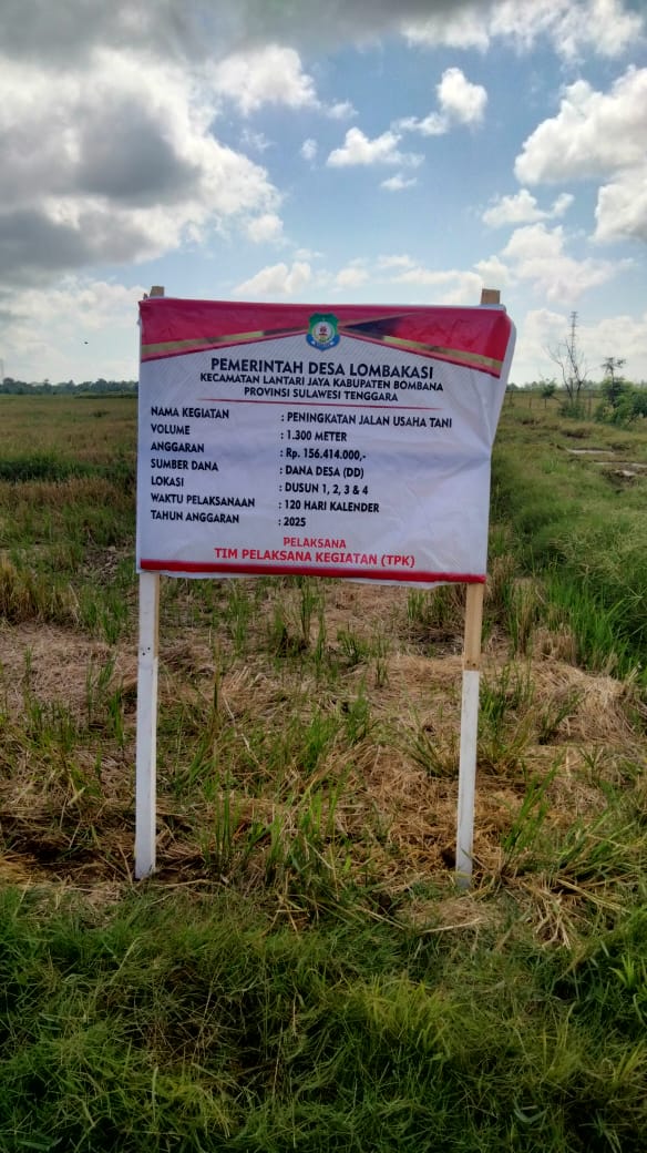 Pemerintah Desa Lombakasi, Kecamatan Lantari Jaya, Kabupaten Bombana, Sulawesi Tenggara (Sultra), terus menunjukkan komitmennya dalam meningkatkan infrastruktur pedesaan. Pada tahun anggaran 2025, desa ini mengalokasikan Dana Desa (DD) untuk pembangunan jalan usaha tani yang membentang dari Dusun 1 hingga Dusun 4.