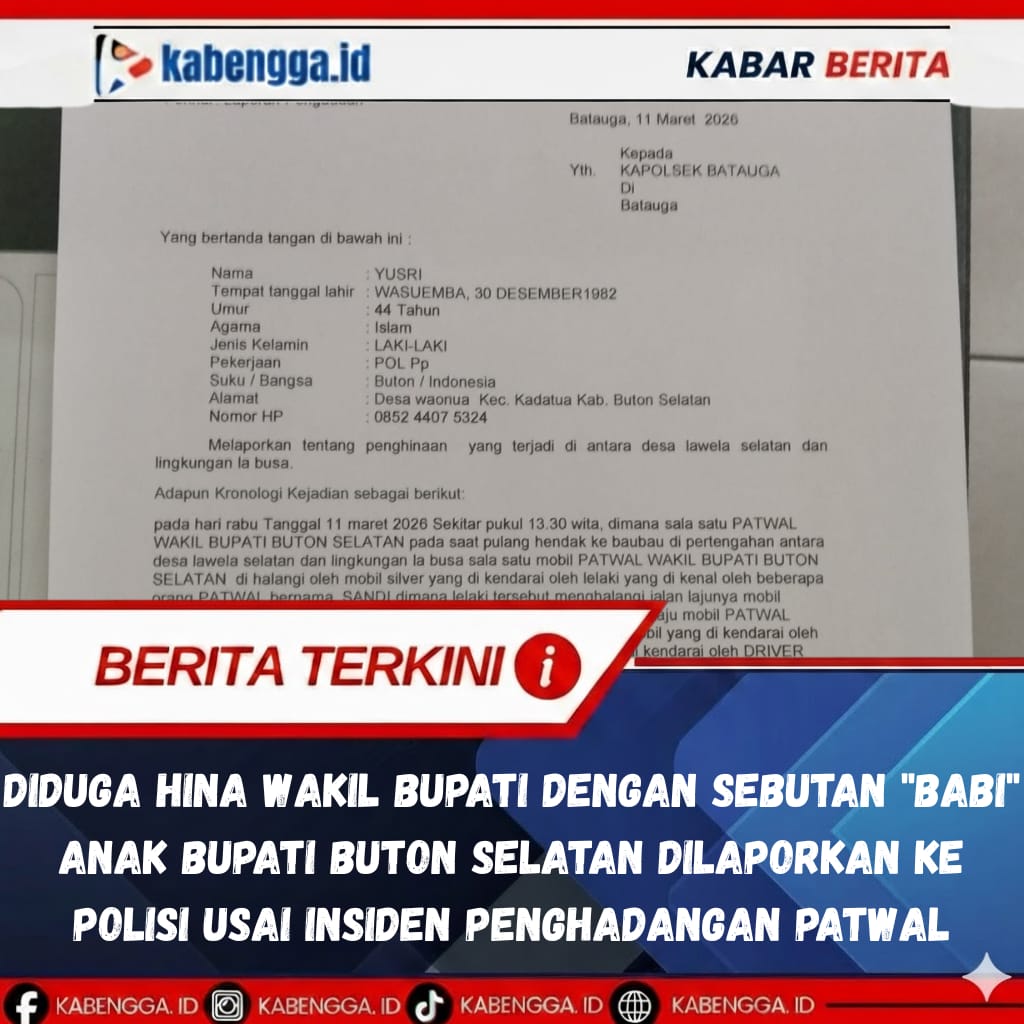 BATAUGA – Dugaan penghinaan terhadap rombongan pengawalan (patwal) Wakil Bupati Kabupaten Buton Selatan (Busel), Sulawesi Tenggara, berujung laporan ke pihak kepolisian. Seorang anggota Satuan Polisi Pamong Praja (Satpol PP) bernama Yusri melaporkan insiden tersebut ke Polsek Batauga pada Rabu (11/3/2026).
