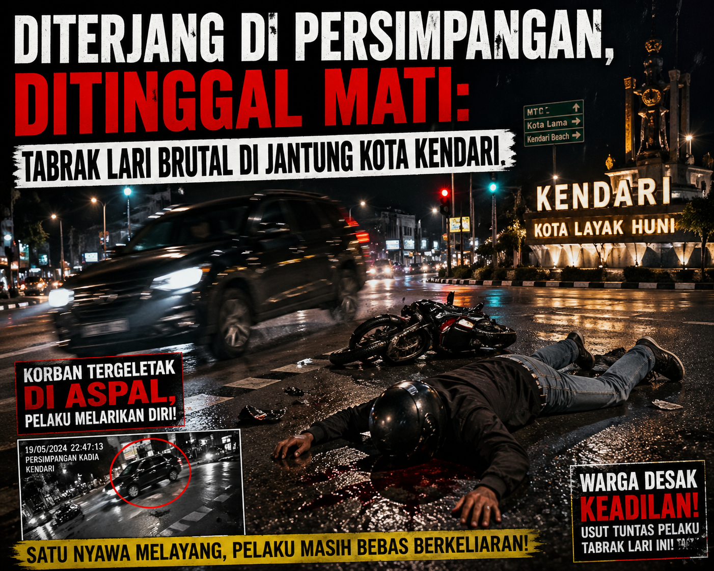 KENDARI, KABENGGA.ID. — Sunyi dini hari di Perempatan Pasar Baru berubah menjadi panggung maut. Sebuah tabrakan keras merenggut nyawa seorang pengendara motor, sementara pelakunya kabur tanpa jejak meninggalkan korban meregang nyawa di tengah jalan.