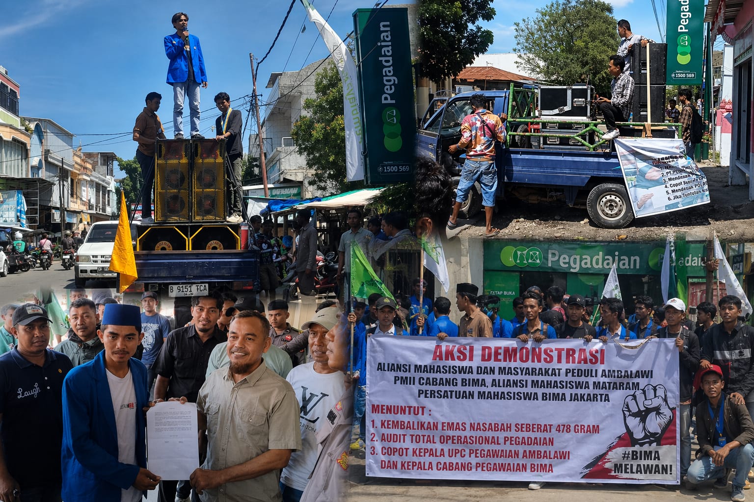 Di Kantor UPC Pegadaian Kecamatan Ambalawi, demonstrasi digelar oleh Aliansi Mahasiswa dan Masyarakat Peduli Ambalawi dan dipimpin oleh Koordinator Lapangan (Korlap), Deden. Di Kantor Pegadaian Cabang Bima yang dilakukan oleh PMII Cabang Bima dipimpin oleh Korlap Hariman.