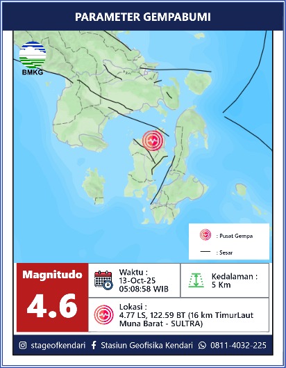 MUNA BARAT – KABENGGA.ID ll Dua gempa bumi beruntun dengan magnitudo 4,4 dan 4,6 mengguncang wilayah Muna Barat, Sulawesi Tenggara, pada Minggu malam (12/10/2025). Akibat guncangan tersebut, satu unit sekolah dasar di daerah itu mengalami kerusakan ringan.