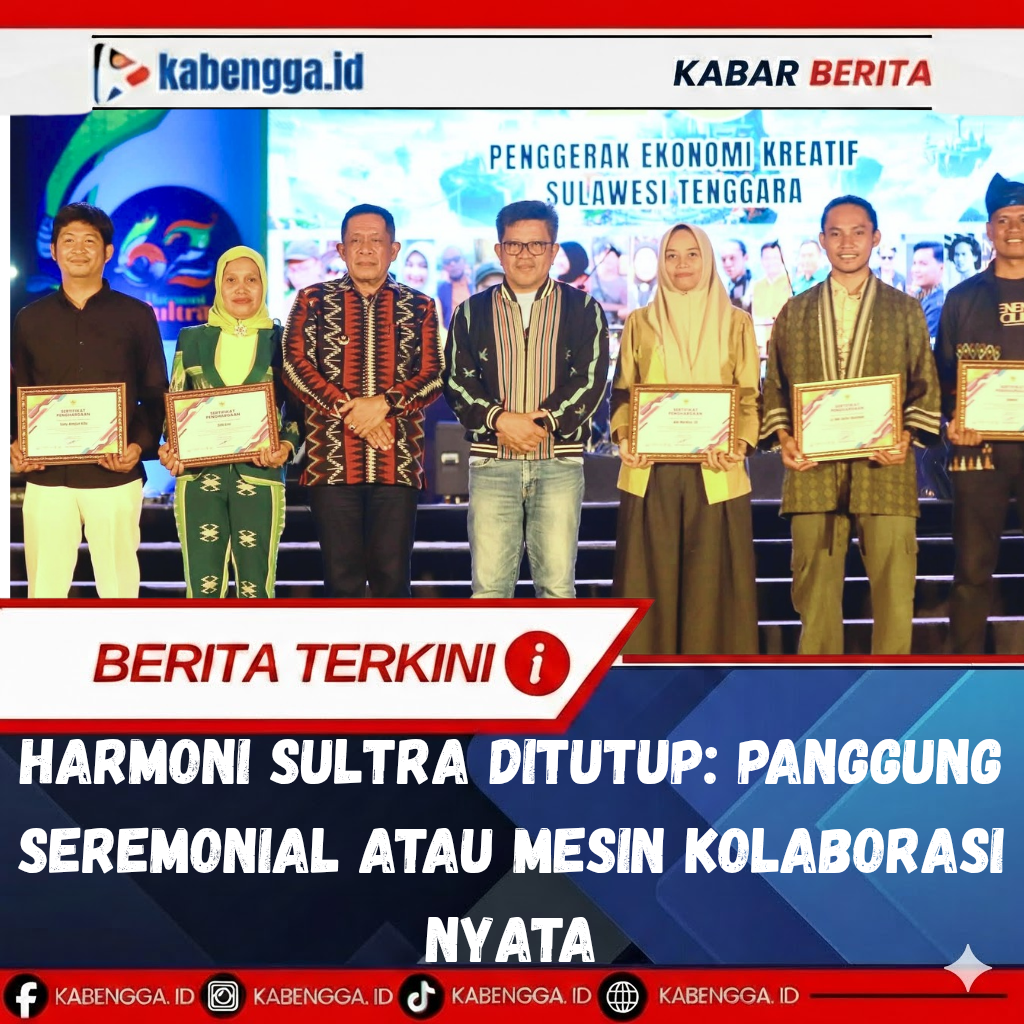 KENDARI, KABENGGA.ID. – Rangkaian Harmoni Sultra 2026 resmi ditutup Wakil Gubernur Sulawesi Tenggara, Dr. Ir. Hugua, di Lapangan Ex-MTQ Kendari, Senin (27/4/2026). Penutupan ini menandai berakhirnya perayaan Hari Ulang Tahun ke-62 Provinsi Sulawesi Tenggara,sebuah agenda besar yang diklaim sebagai ruang kolaborasi lintas sektor.