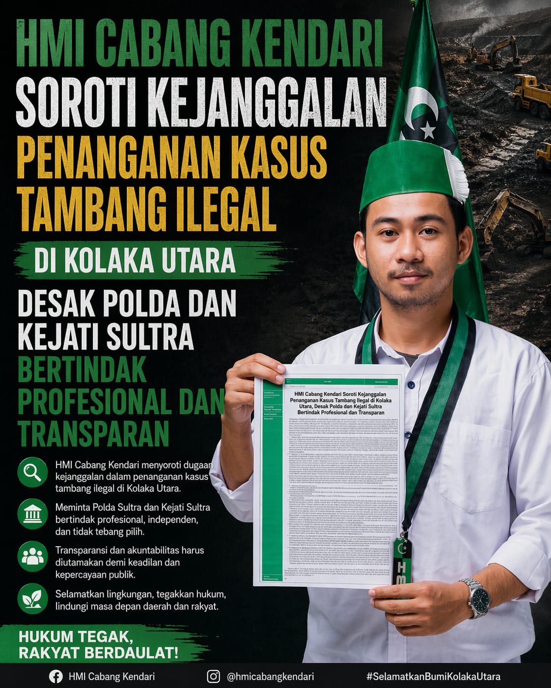 Kendari.Kabengga.Id.. – Himpunan Mahasiswa Islam (HMI) Cabang Kendari menyampaikan sikap tegas terhadap dugaan ketidakkonsistenan dalam penanganan kasus tindak pidana pertambangan ilegal di wilayah IUP PT Kasmar Tiar Raya, Kabupaten Kolaka Utara, Sulawesi Tenggara.