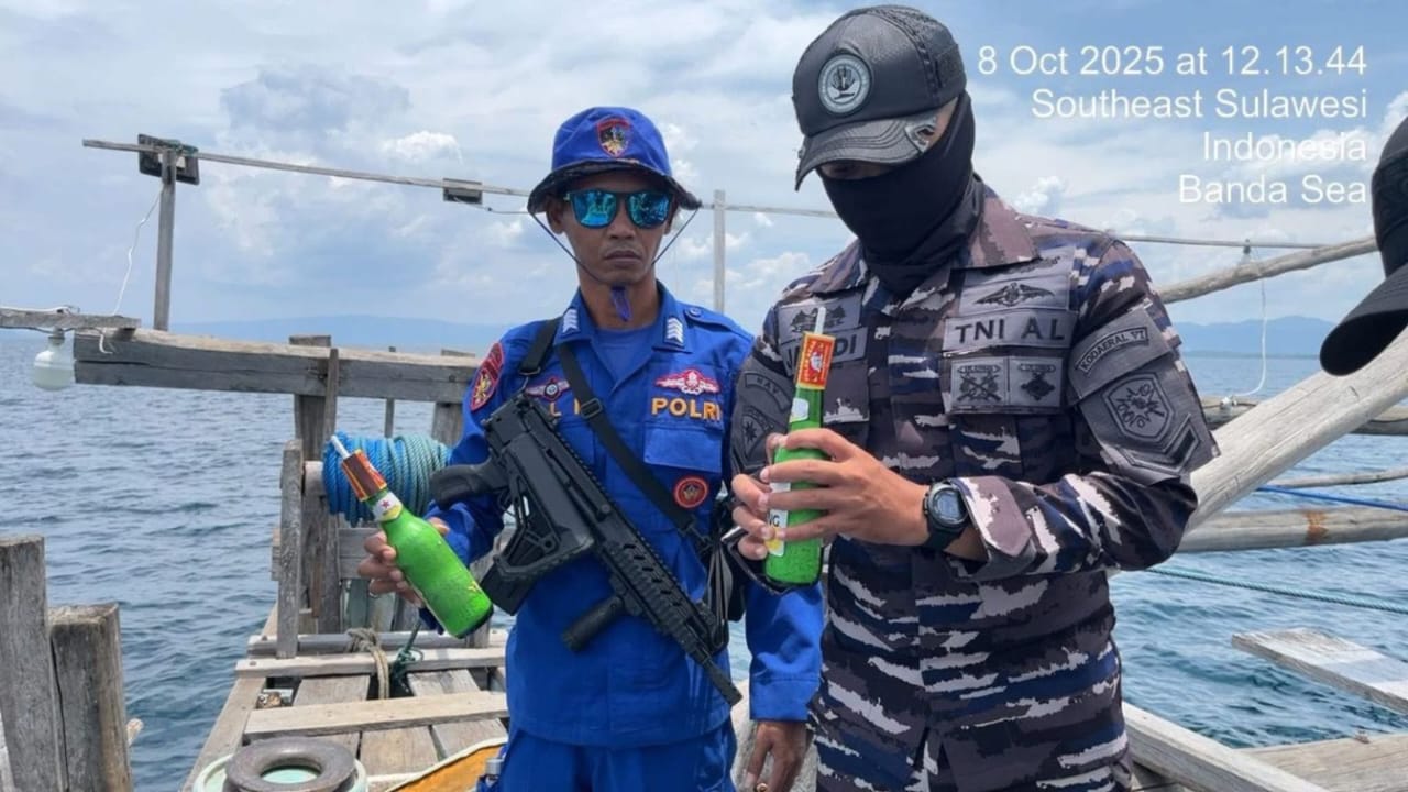 Konawe Selatan ll Kabengga. id – Aksi ilegal di laut kembali terbongkar. Tim Patroli Gabungan yang terdiri dari Dinas Kelautan dan Perikanan (DKP) Provinsi Sulawesi Tenggara, Ditpolairud Polda Sultra, TNI AL, Satwas PSDKP Kendari, serta Balai Pengelolaan Sumberdaya Pesisir dan Laut (BPSPL) Makassar berhasil membekuk dua nelayan yang kedapatan menggunakan bom ikan di perairan Desa Puasana, Kecamatan Moramo Utara, Kabupaten Konawe Selatan, Rabu (8/10/2025) siang.