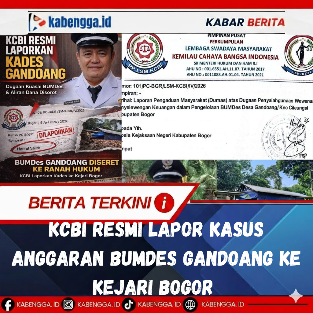 Bogor,Kabengga.Id.– Lembaga Swadaya Masyarakat Kemilau Cahaya Bangsa Indonesia (LSM KCBI) Pimpinan Cabang Bogor secara resmi melaporkan Kepala Desa Gandoang, Kecamatan Cileungsi, Kabupaten Bogor, ke Kejaksaan Negeri Kabupaten Bogor, Kamis (16/04/2026). Laporan tersebut berkaitan dengan dugaan penyalahgunaan wewenang dan ketidaktransparanan dalam pengelolaan Badan Usaha Milik Desa (BUMDes).