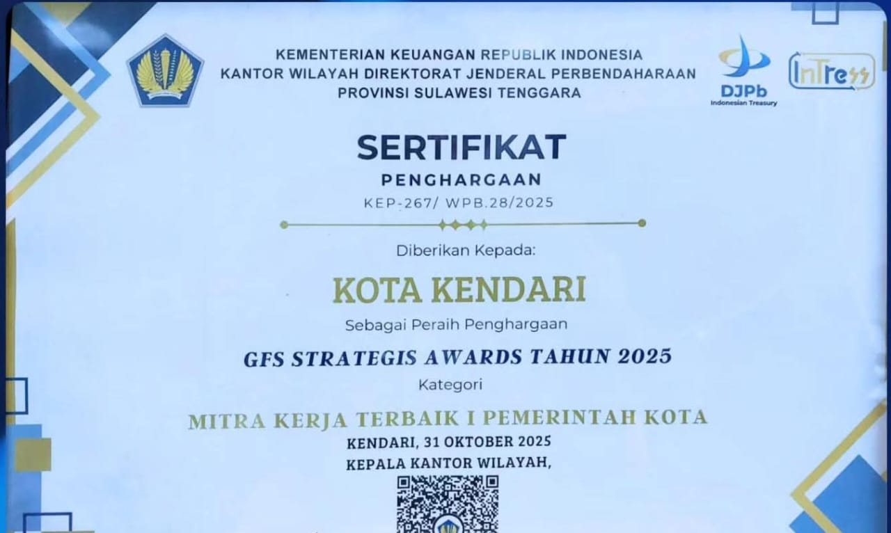 Kendari — Kabengga.id ll Komitmen Pemerintah Kota Kendari dalam mewujudkan tata kelola keuangan yang transparan dan akuntabel kembali berbuah manis. Kota Kendari berhasil meraih peringkat pertama kategori Mitra Kerja Terbaik Pemerintah Kota pada ajang Government Finance Statistics (GFS) Strategis Awards 2025, yang digelar oleh Kantor Wilayah Direktorat Jenderal Perbendaharaan (DJPb) Sulawesi Tenggara, Jumat (7/11/2025).