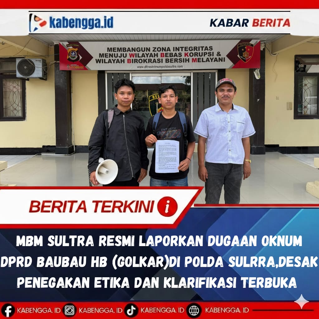 Kendari. Kabengga.Id, – Mahasiswa Banteng Muda (MBM) Sulawesi Tenggara secara resmi telah menyampaikan pengaduan masyarakat kepada Kepolisian Daerah Sulawesi Tenggara terkait dugaan tindakan yang tidak mencerminkan etika dan profesionalitas pejabat publik oleh oknum anggota DPRD Kota Baubau dari Partai Golongan Karya berinisial HB.