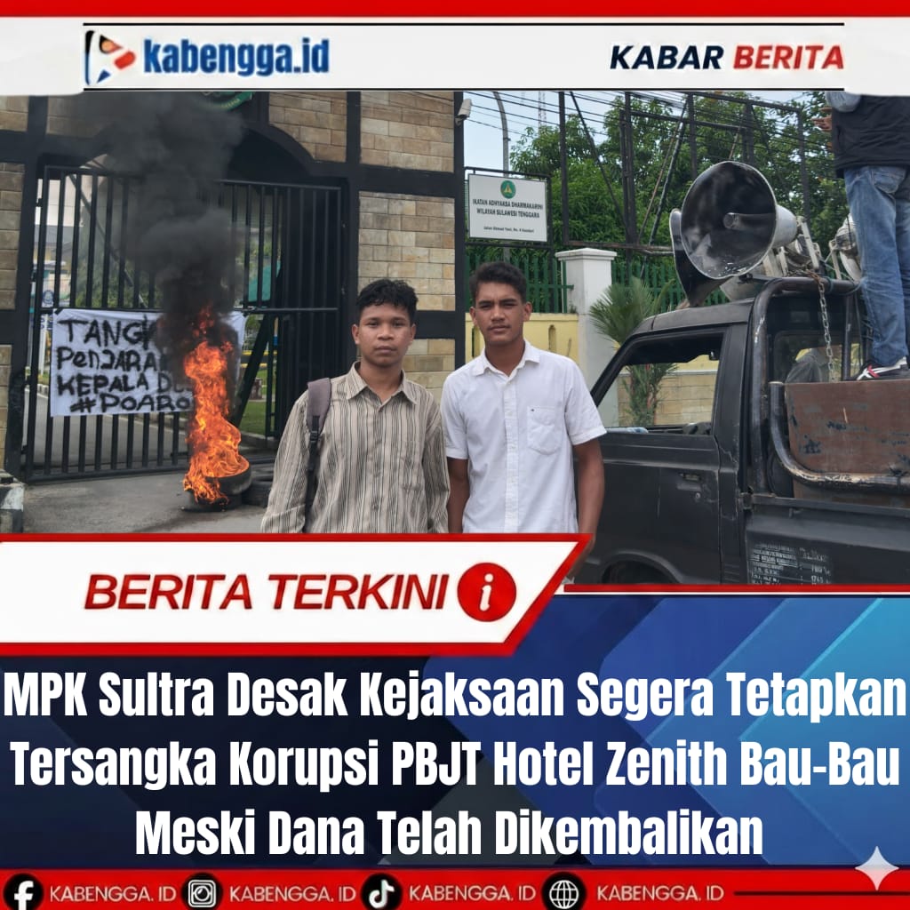 KENDARI – Lembaga Mahasiswa Pemerhati Korupsi Sulawesi Tenggara (MPK Sultra) menyatakan keprihatinan dan sikap tegas atas lambannya penanganan dugaan tindak pidana korupsi dalam pengelolaan Pajak Barang dan Jasa Tertentu (PBJT) di Hotel Zenith Primer Baubau. Kami mendesak Kejaksaan Tinggi Sulawesi Tenggara untuk segera meningkatkan status penanganan perkara ini ke tingkat penyidikan dan menetapkan pihak-pihak yang bertanggung jawab sebagai tersangka,[Minggu 1 Maret 2026].