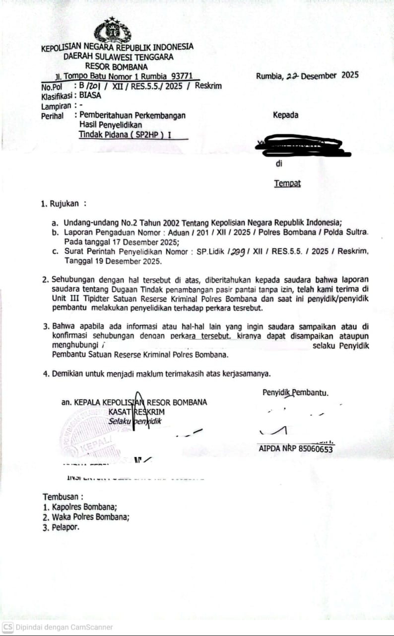 Atas laporan resmi APKD, Polres Bombana telah menerbitkan Surat Pemberitahuan Perkembangan Hasil Penyelidikan (SP2HP) Nomor B/201/XII/RES.5.5/2025/Reskrim tertanggal 22 Desember 2025, yang menegaskan bahwa perkara ini telah resmi masuk tahap penyelidikan oleh Unit III Tipidter Satreskrim Polres Bombana.