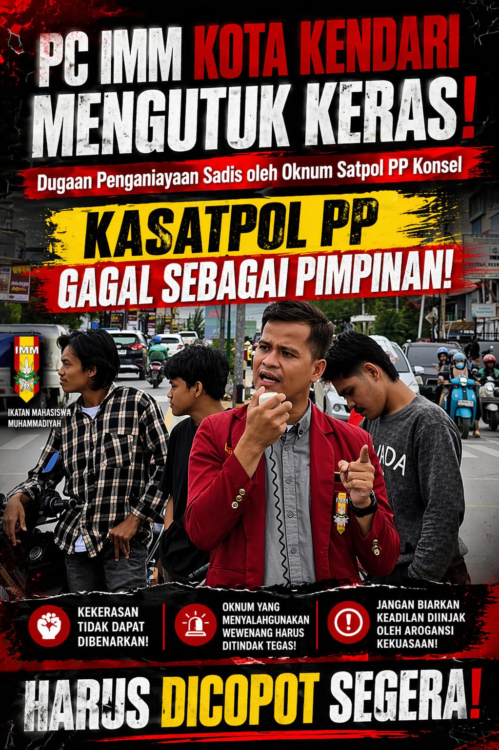 Dirman, Ketua Umum PC IMM Kota Kendari menuntut tindakan tegas dan segera, khususnya kepada Kasatpol PP Konsel: