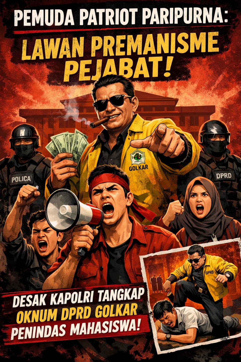 Segera instruksikan jajaran di daerah untuk menangkap dan memeriksa oknum DPRD tersebut atas dugaan pengancaman dan perbuatan tidak menyenangkan. Hukum harus ditegakkan tanpa pandang bulu, termasuk terhadap elit partai. - Pecat dari Keanggotaan DPRD