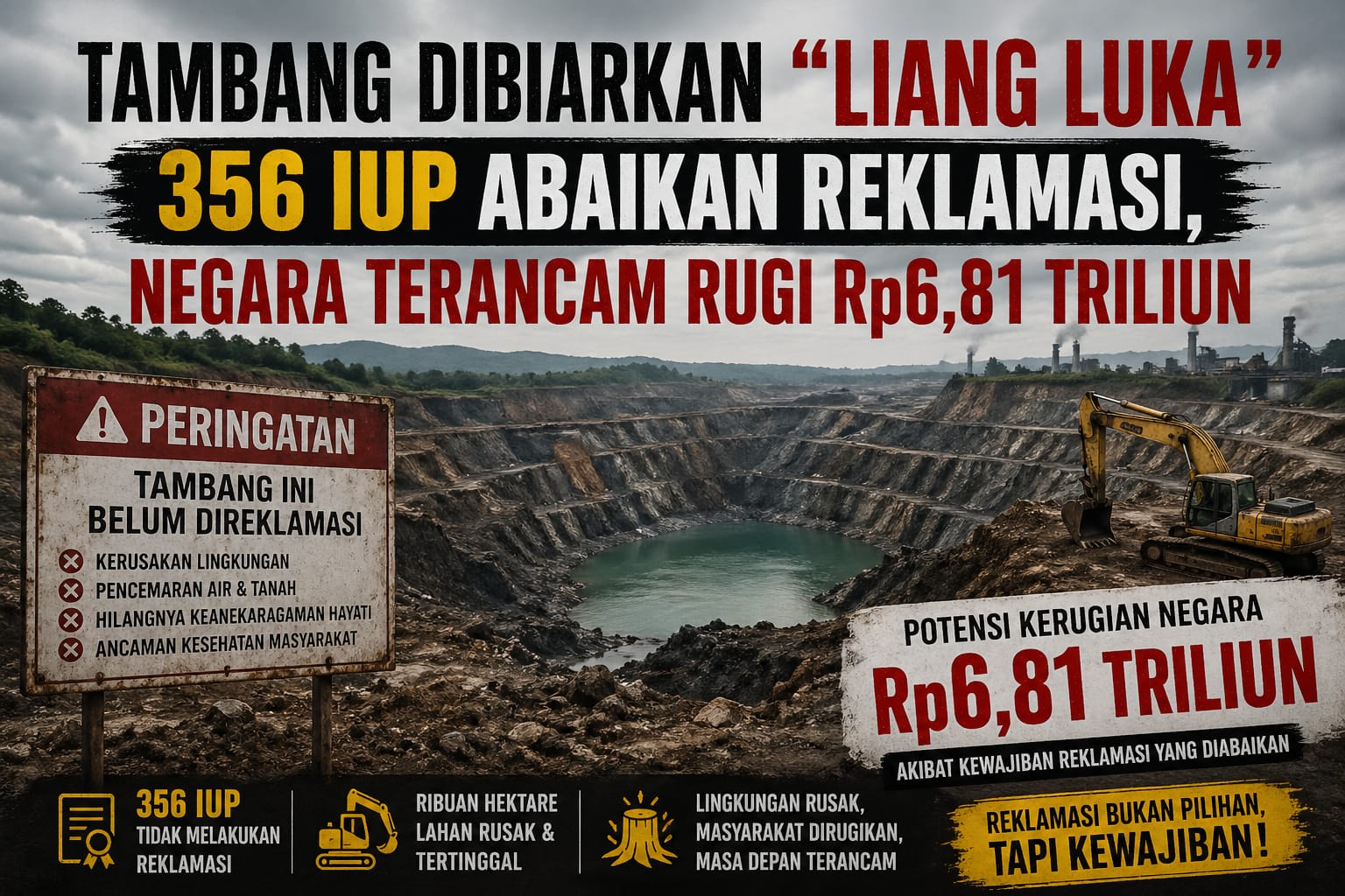 Dalam Ikhtisar Hasil Pemeriksaan Semester (IHPS) II Tahun 2025, BPK mencatat 356 pemegang IUP belum melaksanakan kewajiban reklamasi dan pascatambang di area seluas 6.561 hektare. Lahan-lahan itu kini menjadi “liang luka” yang berpotensi memicu pencemaran dan kerusakan lingkungan berkepanjangan.